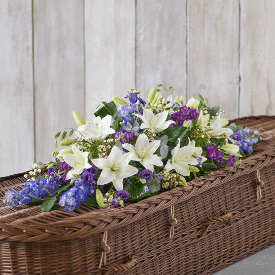 Blue & White Coffin Spray, a beautiful array of blue, purple and white blooms available for delivery or instore collection call 01506 811 433.