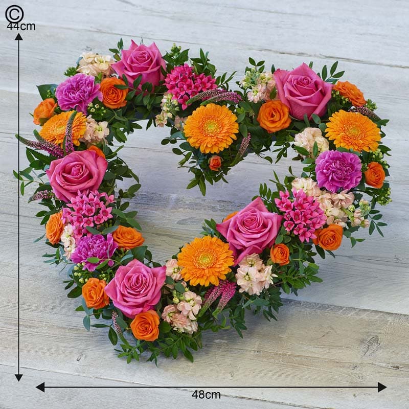 Bold Brights Funeral Heart is a vibrant combination of colourful flowers in an open heart design, offering a bright way to express sympathy and remembrance.