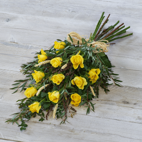 Classic Rose Sheaf is a dozen roses contrast beautifully with silvery eucalyptus foliage and natural elements including dried wheat, natural birch and a raffia bow. Available in Red, White, Yellow or Pink.
