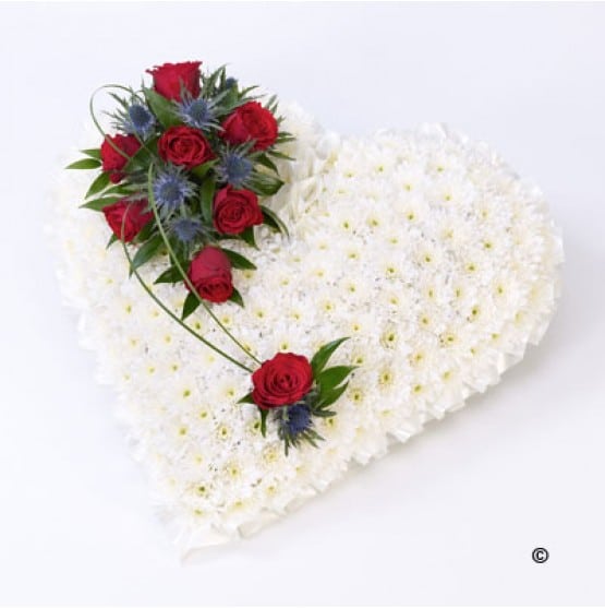 Classic White Heart With Roses, a popular heart tribute with a ribbon edge white base and in beautiful red rose top spray, we can change the ribbon and top spray to a colour of your choice.