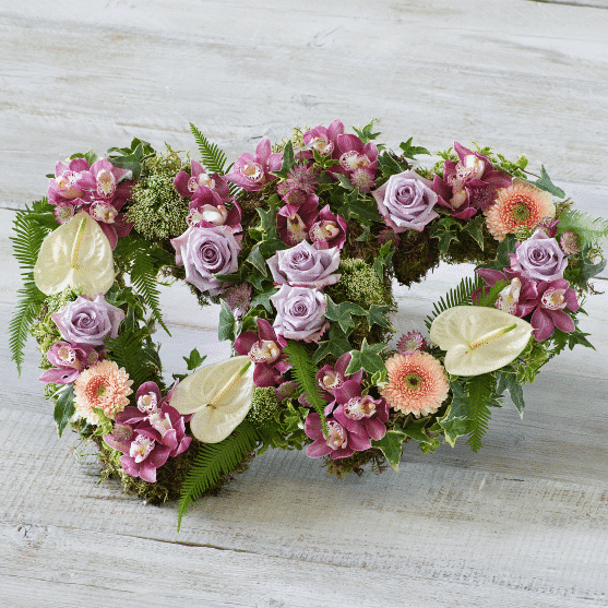 The deluxe double funeral heart is two beautiful hearts with an open design, each features the finest orchids, anthuriums, and delicate lilac roses nestled in fresh foliage.