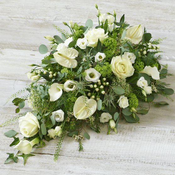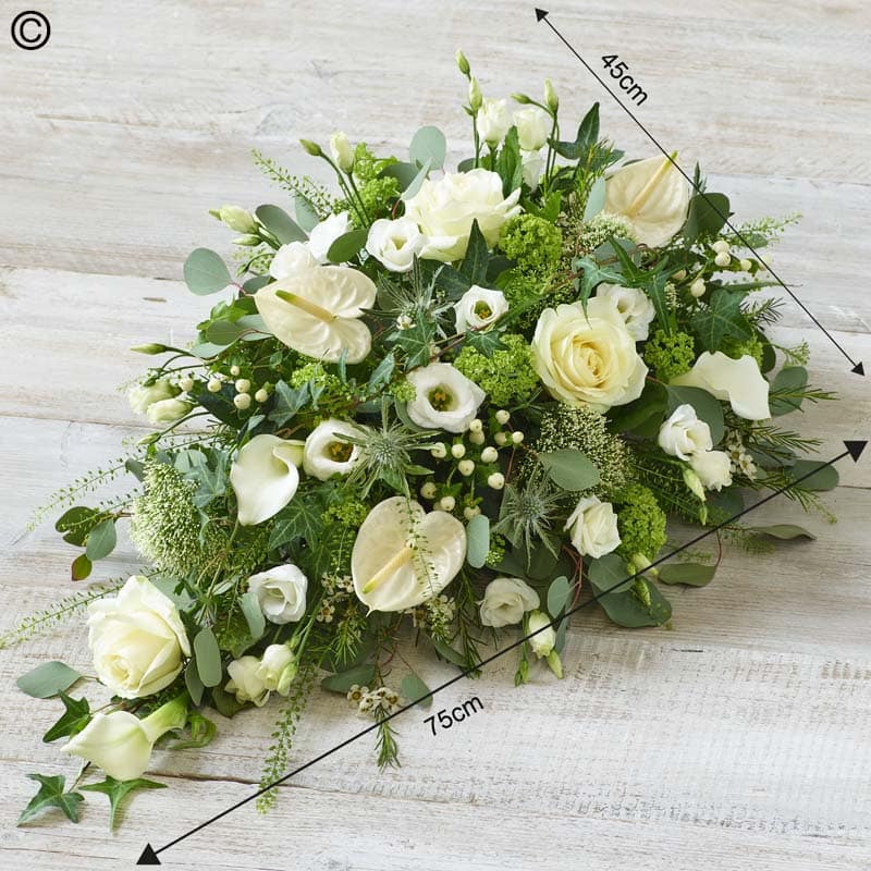 A deluxe white funeral spray made with a delicate mix of blooms including roses and lisianthus. Arranged by Williamson’s in a teardrop shape. Available for delivery or collection online or from our stores.