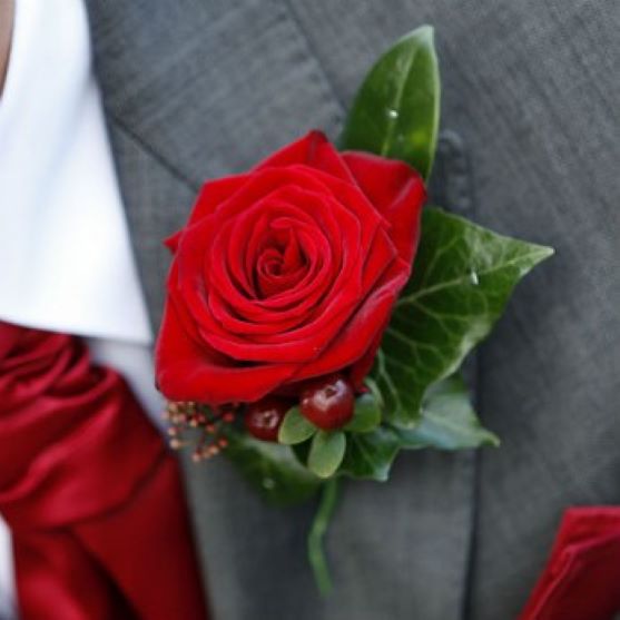 Gents Single Rose & Berries buttonhole. (Store Collection Only) Available in 7 colour options. Please call 01506811433 or order online.