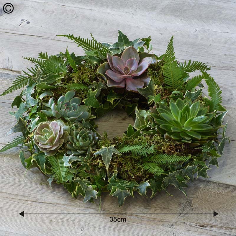 Living Succulent Funeral Wreath made using a wire and moss base (with no floral foam) this funeral wreath is eco-friendly. Featuring stunning suculents it’s designed to live on after the service.