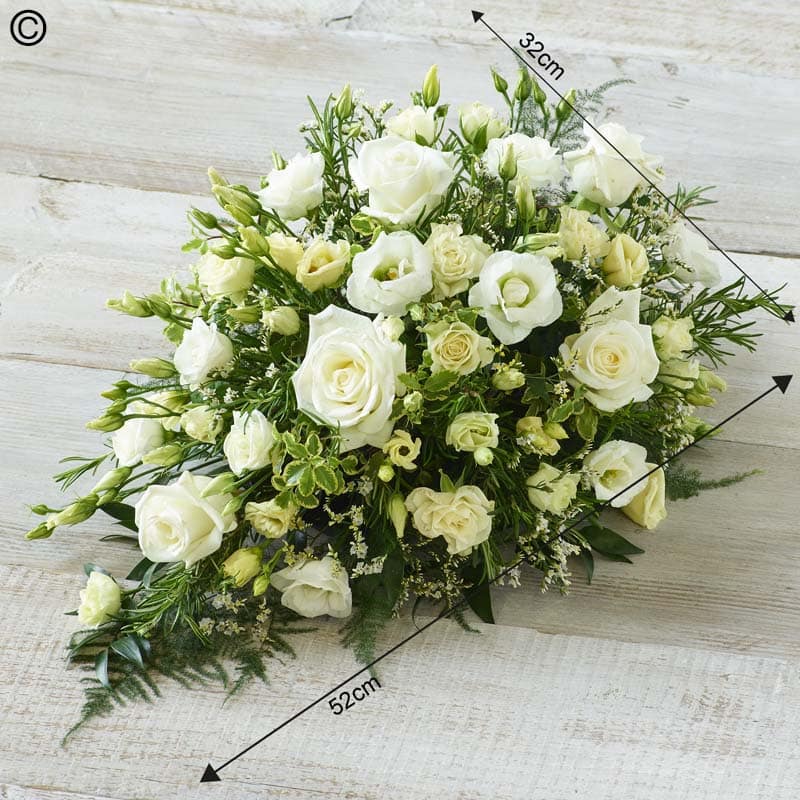 A petite white funeral spray with a delicate mix of blooms including roses and lisianthus. Arranged by Williamson’s in a teardrop shape. Available for delivery or collection from our stores.