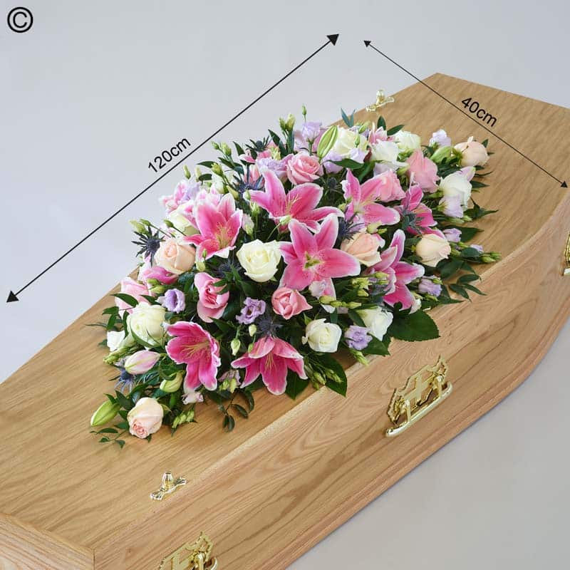 Rose and Eryngium Funeral Coffin Spray. One of our most popular designs, this casket spray is a profusion of pastel blooms including pink and ivory roses and pink oriental lilies.