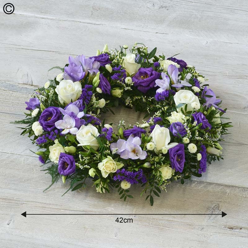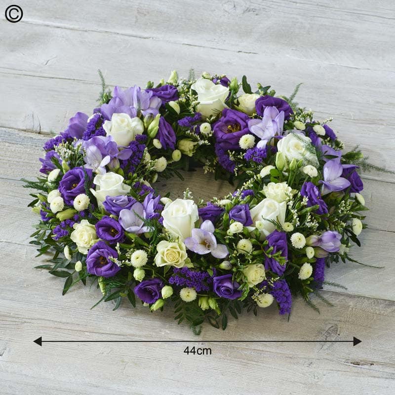 Scented blue funeral wreath has been a firm favourite at Williamsons since 1935, here is a classic selection wreath of flowers including irises, carnations and spray chrysanthemums in blues and whites are nestled into this traditional circular wreath. Williamson’s My Florist have been delivering our customers thoughts, sympathy and emotions since 1935.