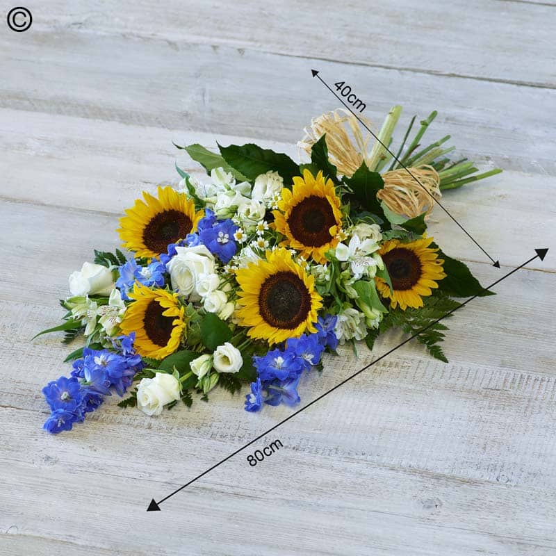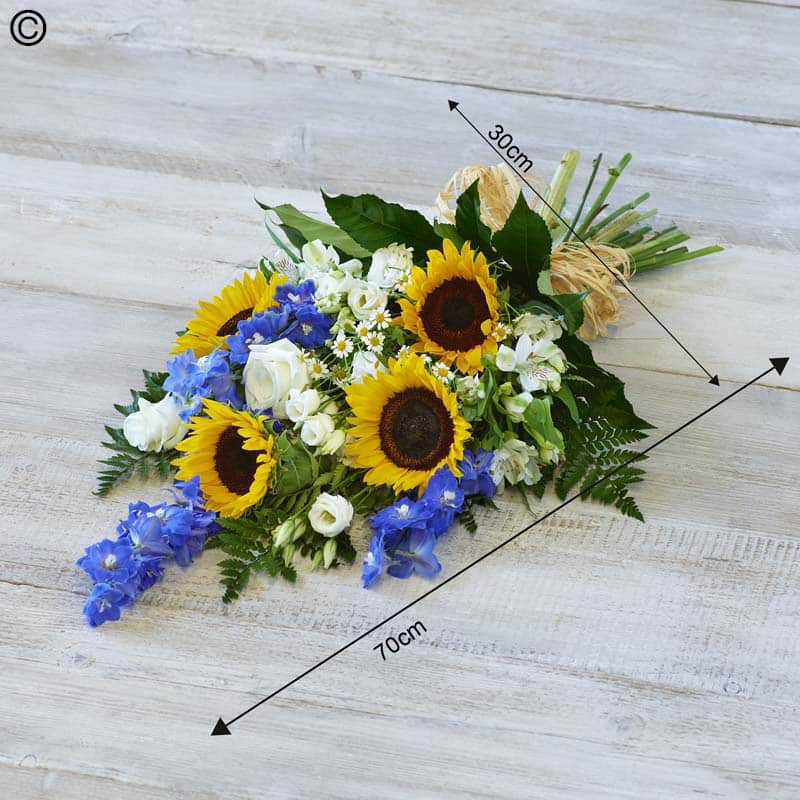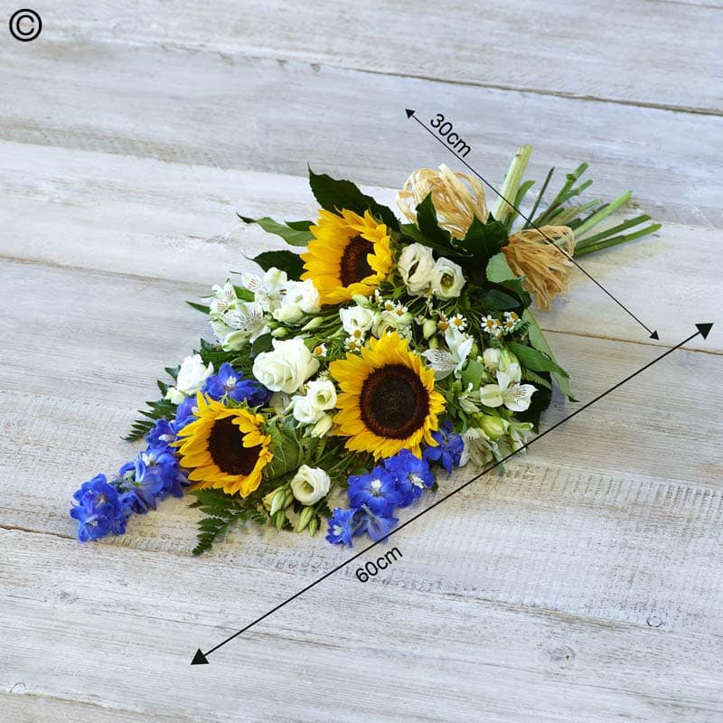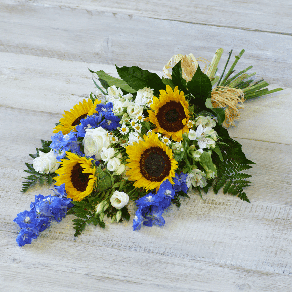 Sunflower Medley Funeral Sheaf A gorgeous summery medley featuring warm sunflowers, bright blue and seasonal flowers.