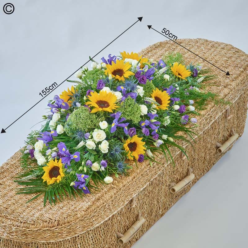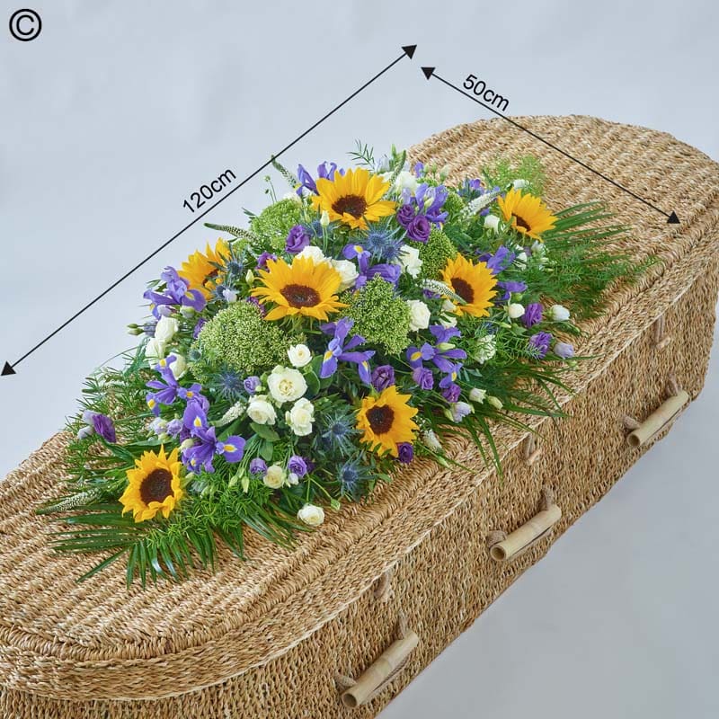 Sunflower Mixed Coffin Spray. This casket spray is a beautiful summery mix featuring sunflowers, irises, spray roses and lush foliage.