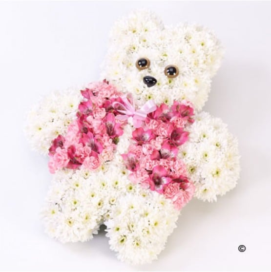 Double spray chrysanthemums, spray carnations and alstroemeria are used to create this pink and white design shaped like a teddy bear. Other special tribute shapes are available just contact us for details on 01506 811 433