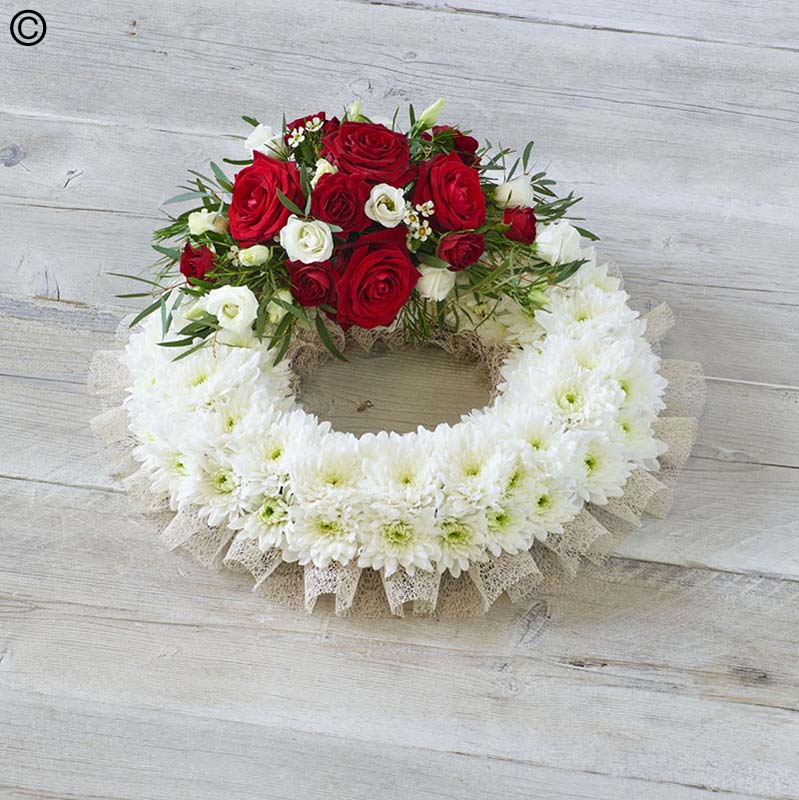 A Traditional Red Wreath of white chrysanthemums contrasted with red roses, white lisianthus and delicate foliage. This elegant floral arrangement offers a heartfelt way to express sympathy and remembrance. Carefully handcrafted by Williamsons My Florist, it’s a popular choice for funeral services and memorials.  Available for delivery or collection.