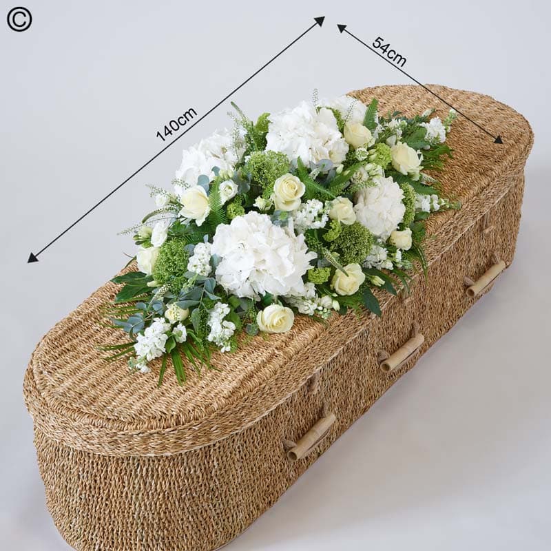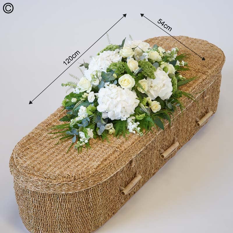 White & Green Coffin Spray, A beautiful coffin spray in classic green and white colours, for delivery or collection call 01506 811 433