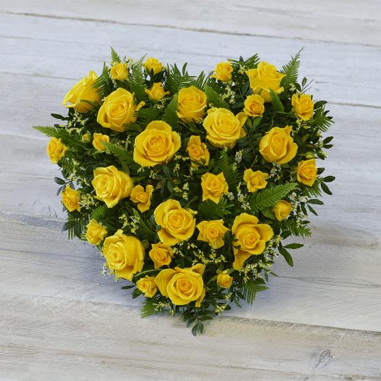 A yellow rose heart vibrant funeral tribute featuring gorgeous roses, spray roses and foliage. Williamson’s My Florist have been delivering our customers thoughts, sympathy and emotions since 1935.